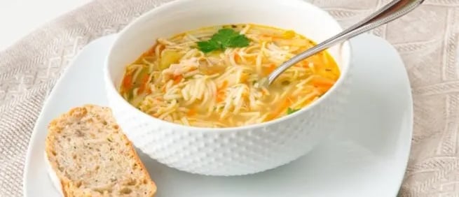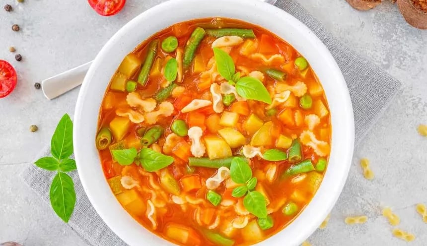Una sopa contundente que vale como plato único. Lleva verduras, legumbres y pasta. Es salud en un bol.