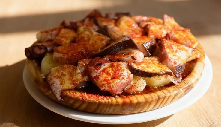 💡 La Herramienta Clave: Servir el pulpo en un plato de cerámica es un error: el aceite resbala y el pulpo se enfría rápido. La tradición manda usar un Plato de Madera de Pino. La madera absorbe el exceso de agua de la cocción, mantiene el calor y permite que el aceite y el pimentón creen esa salsa maravillosa sin que "nade" todo el plato. Es el detalle que hace que parezca que estás en Galicia.