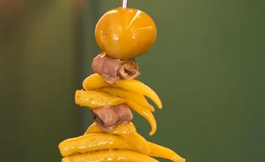 El montaje es simple pero tiene su orden: Inserta una aceituna, luego dobla una anchoa sobre sí misma, inserta la piparra (doblada si es muy larga) y cierra con otra aceituna (opcional).